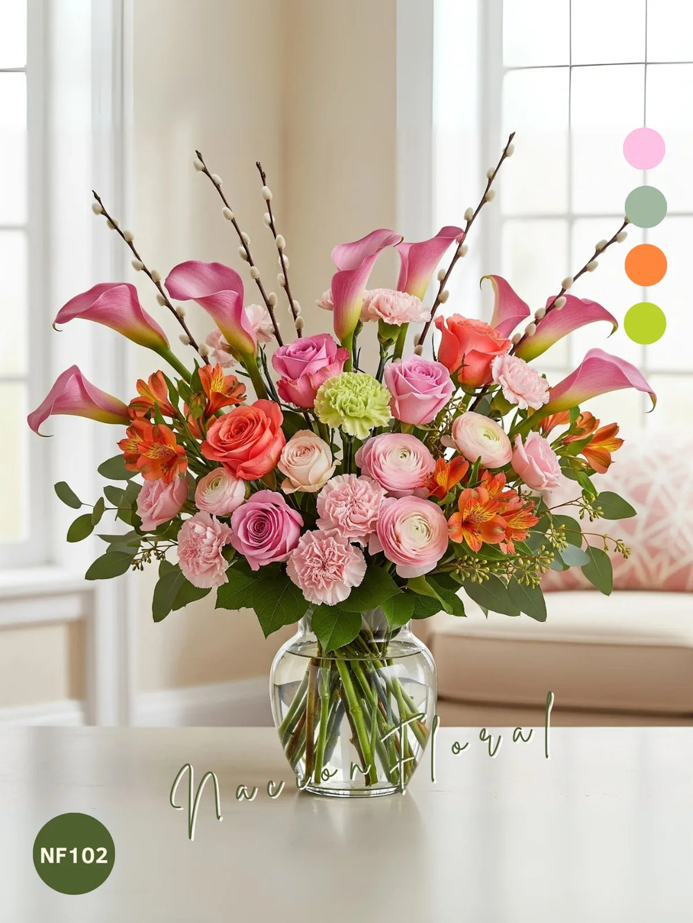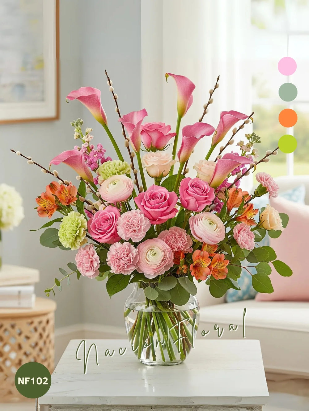 Sumérgete en una fusión vibrante de alegría y sofisticación con este impresionante arreglo floral. Doce rosas naranja y doce rosas rosa se combinan con diez alstroemerias naranja, diez callas rosa, diez claveles rosa y diez claveles verdes, además de diez ranunculus rosa. Esta rica paleta de colores y texturas crea una sinfonía visual que irradia calidez y elegancia, diseñada para capturar la atención y evocar una sensación de bienestar.