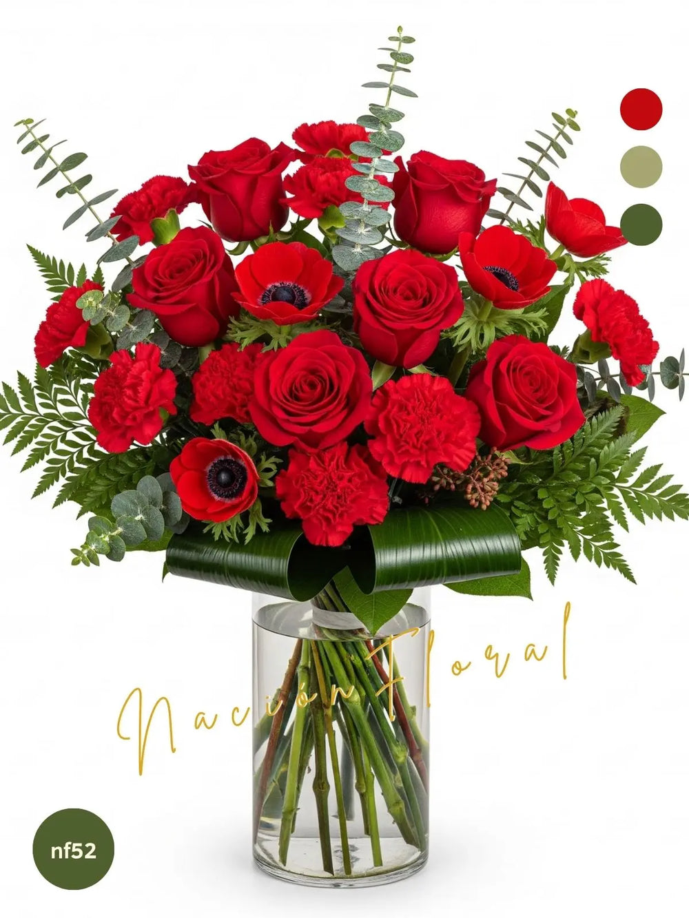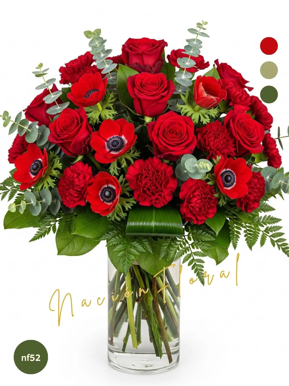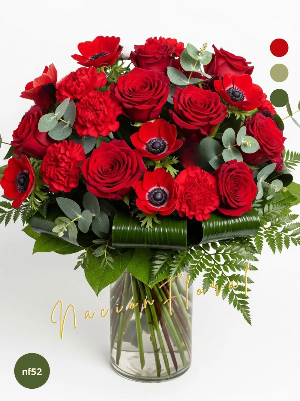 Sumérgete en la pasión y el romance con nuestro vibrante arreglo floral. Doce rosas rojas, diez anémonas rojas y diez claveles rojos se unen en una explosión de color intenso.
