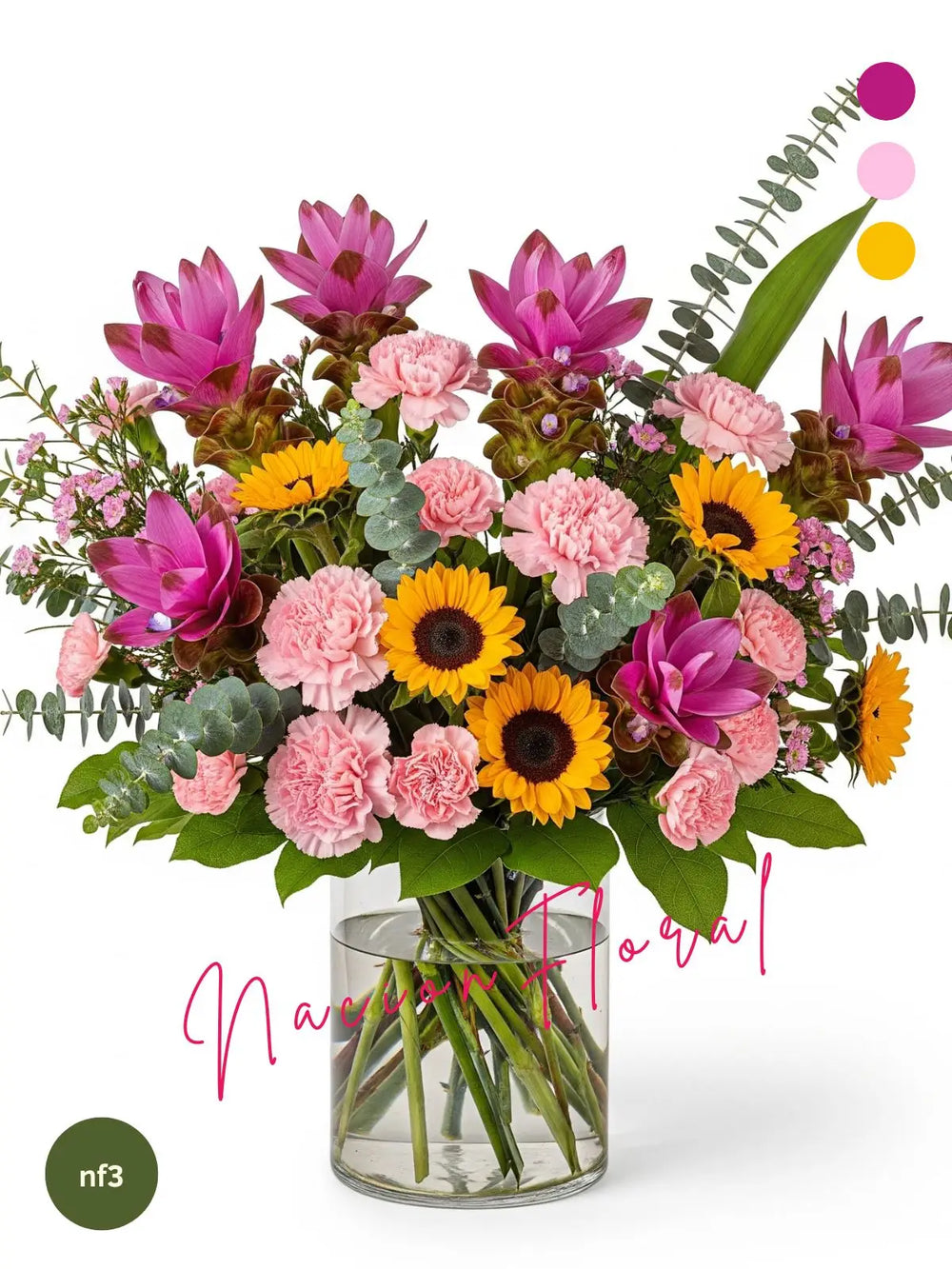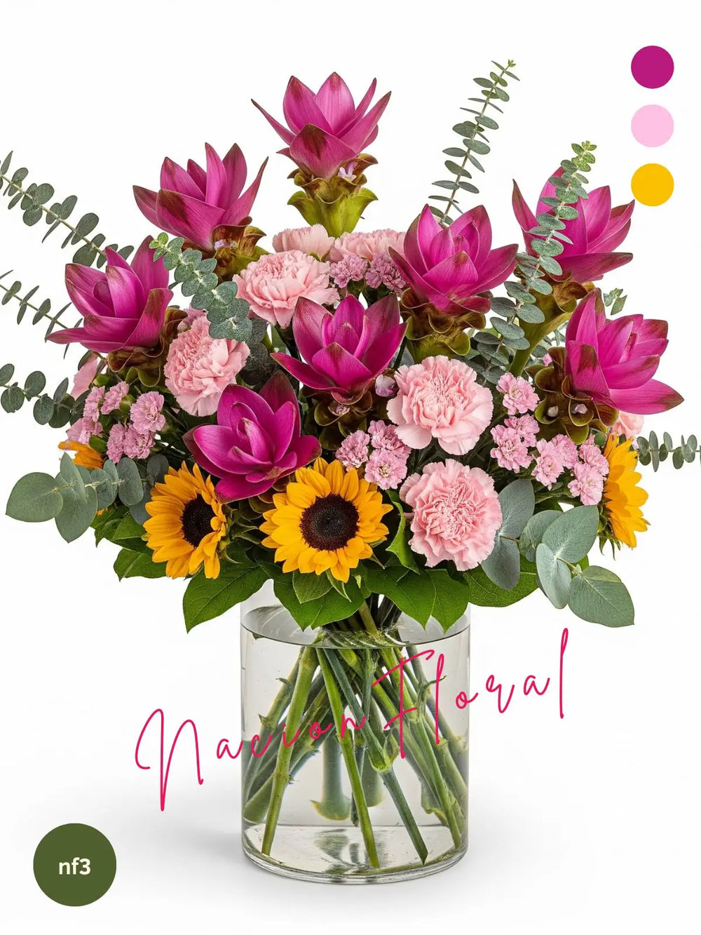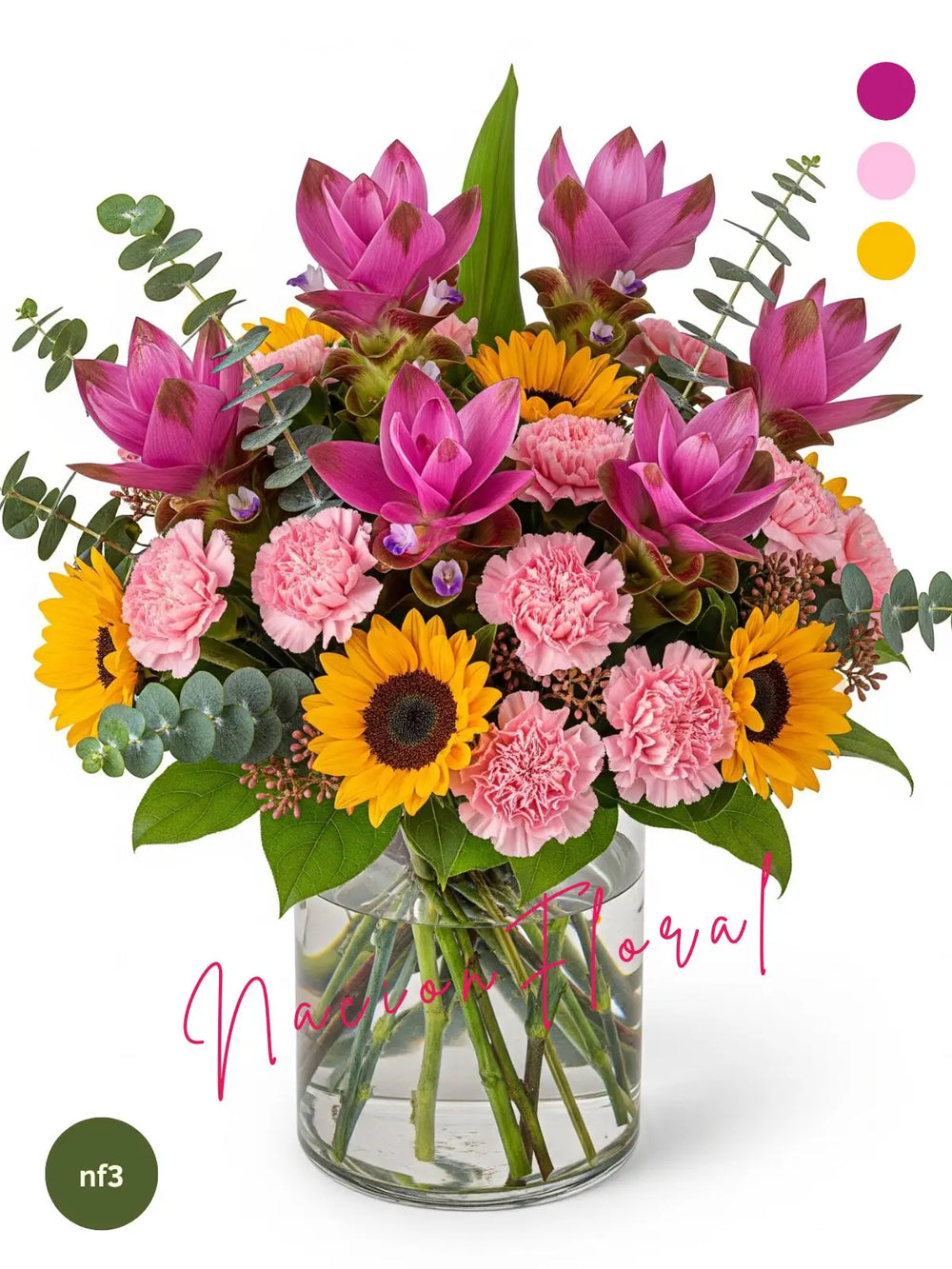 Estilo sugerido: silvestre y generoso, con los girasoles repartidos de manera equilibrada, las cúrcumas como focos altos y verticales, y los claveles agrupados suavemente entre el follaje.