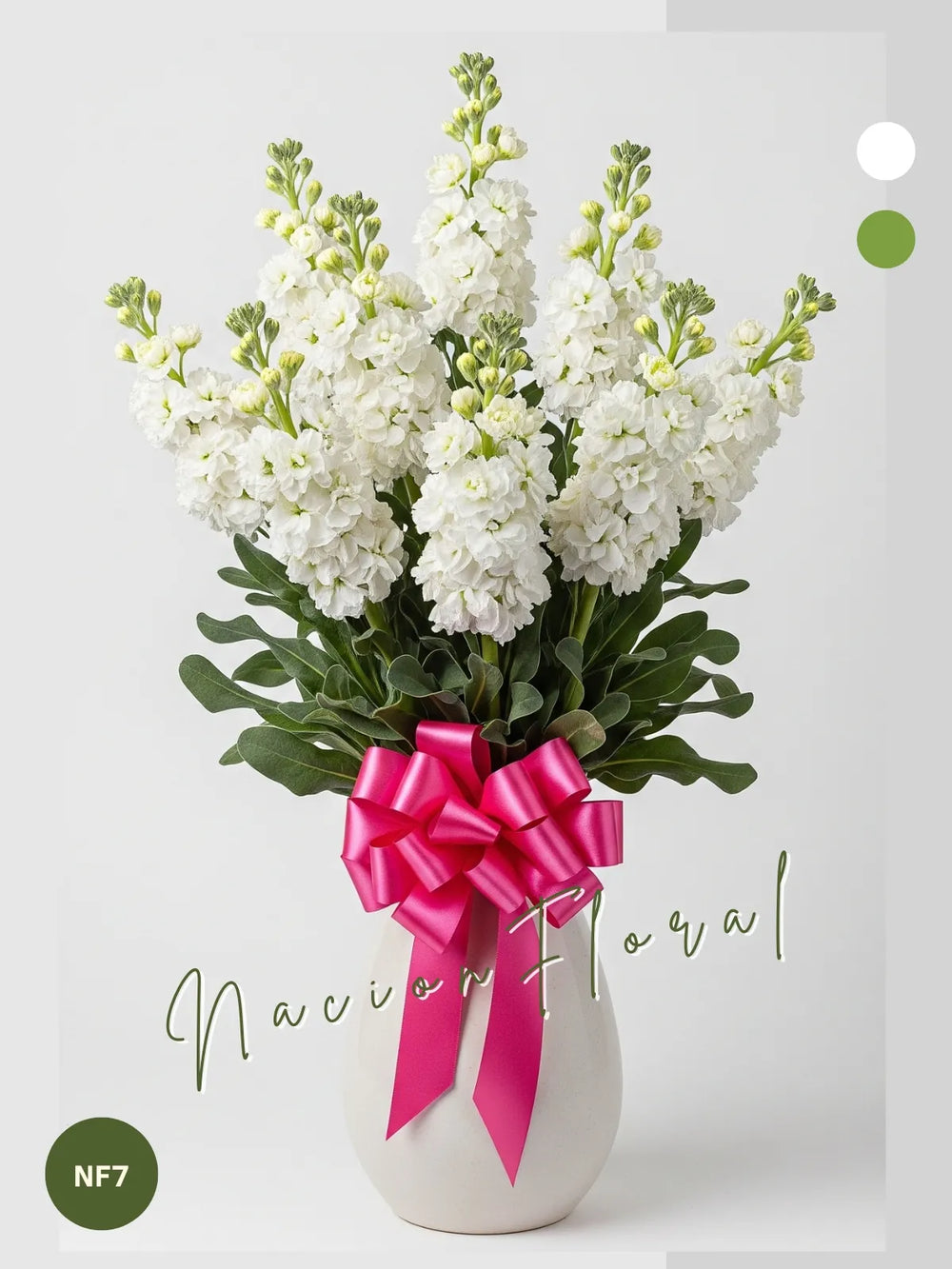 El arreglo floral "Romance Fucsia" es una expresión sublime de elegancia y pasión. Cada Matthiola ha sido cuidadosamente seleccionada, aportando una textura rica y un aroma delicado que evoca serenidad y sofisticación. Presentadas en un florero de cerámica blanco tipo jarrón, estas flores resaltan con una pureza visual que armoniza con cualquier espacio, desde un rincón íntimo hasta el centro de atención de una celebración. El toque final lo da un vibrante moño de listón satinado color fucsia, que añade un estallido de color y un aire de romanticismo moderno. "Romance Fucsia" no es solo un arreglo, es una declaración de belleza duradera y un regalo inolvidable que capturará corazones y realzará cualquier ocasión especial.