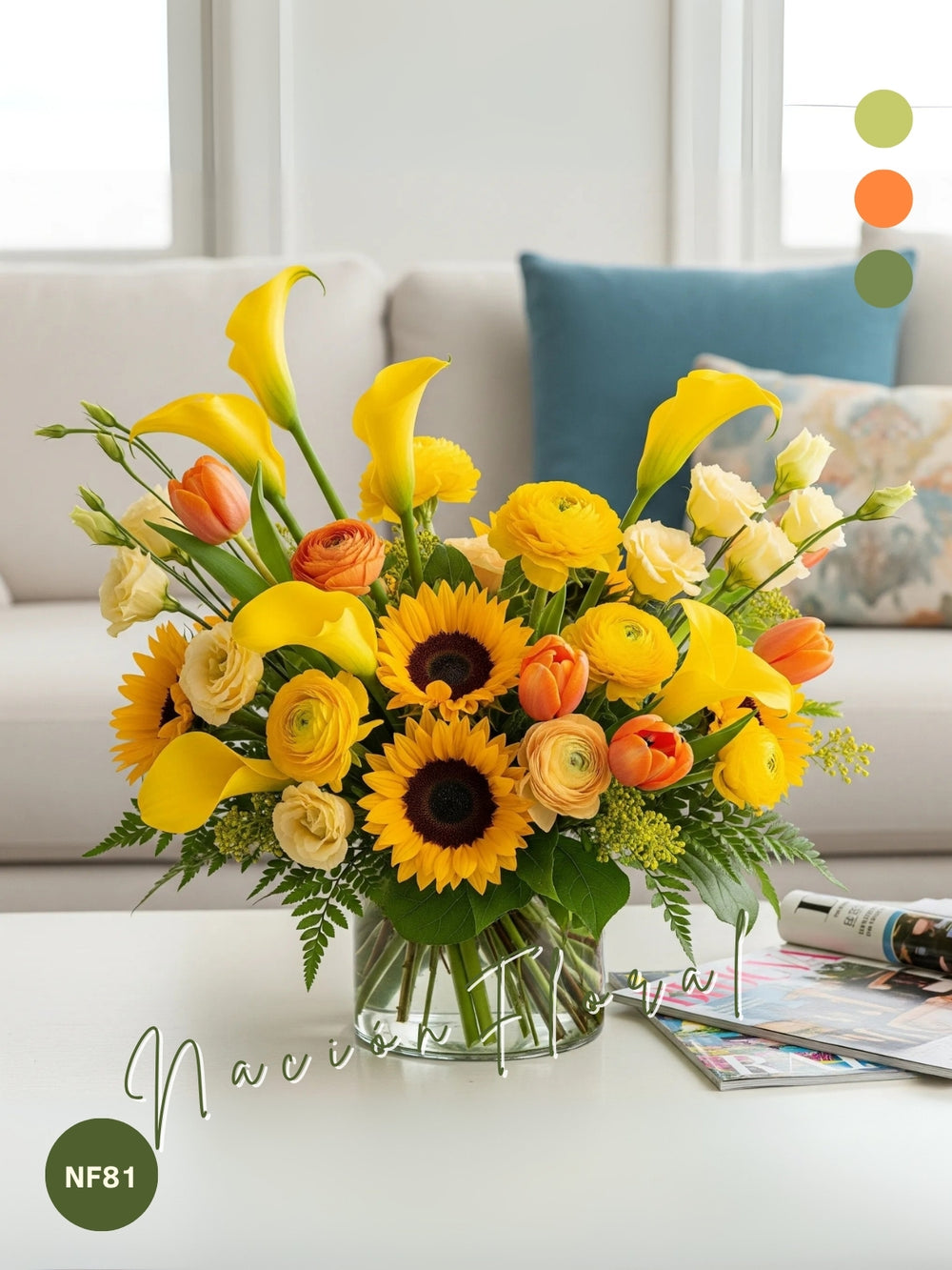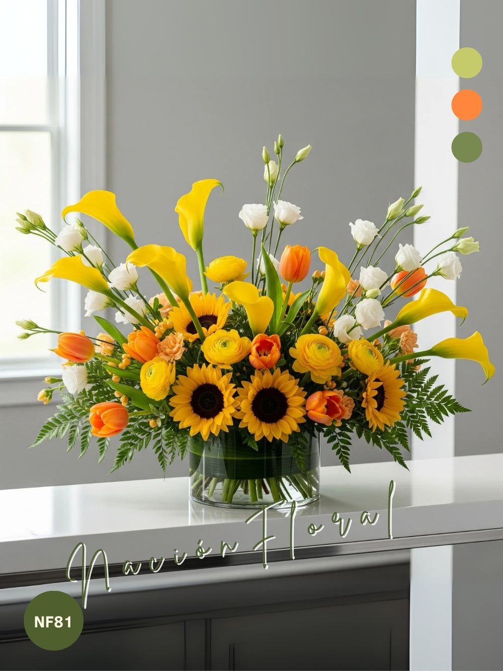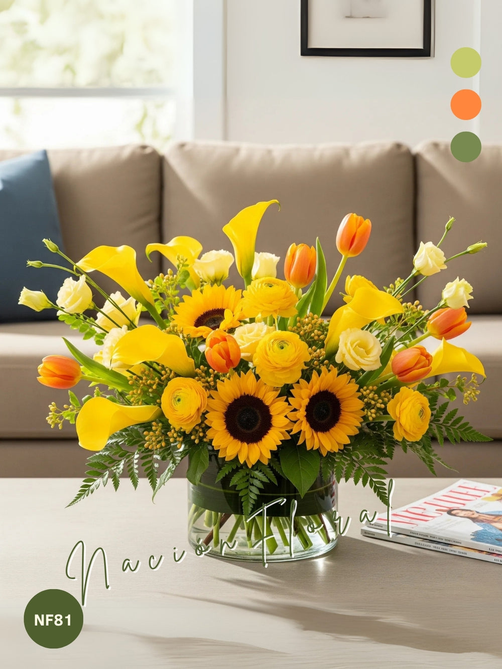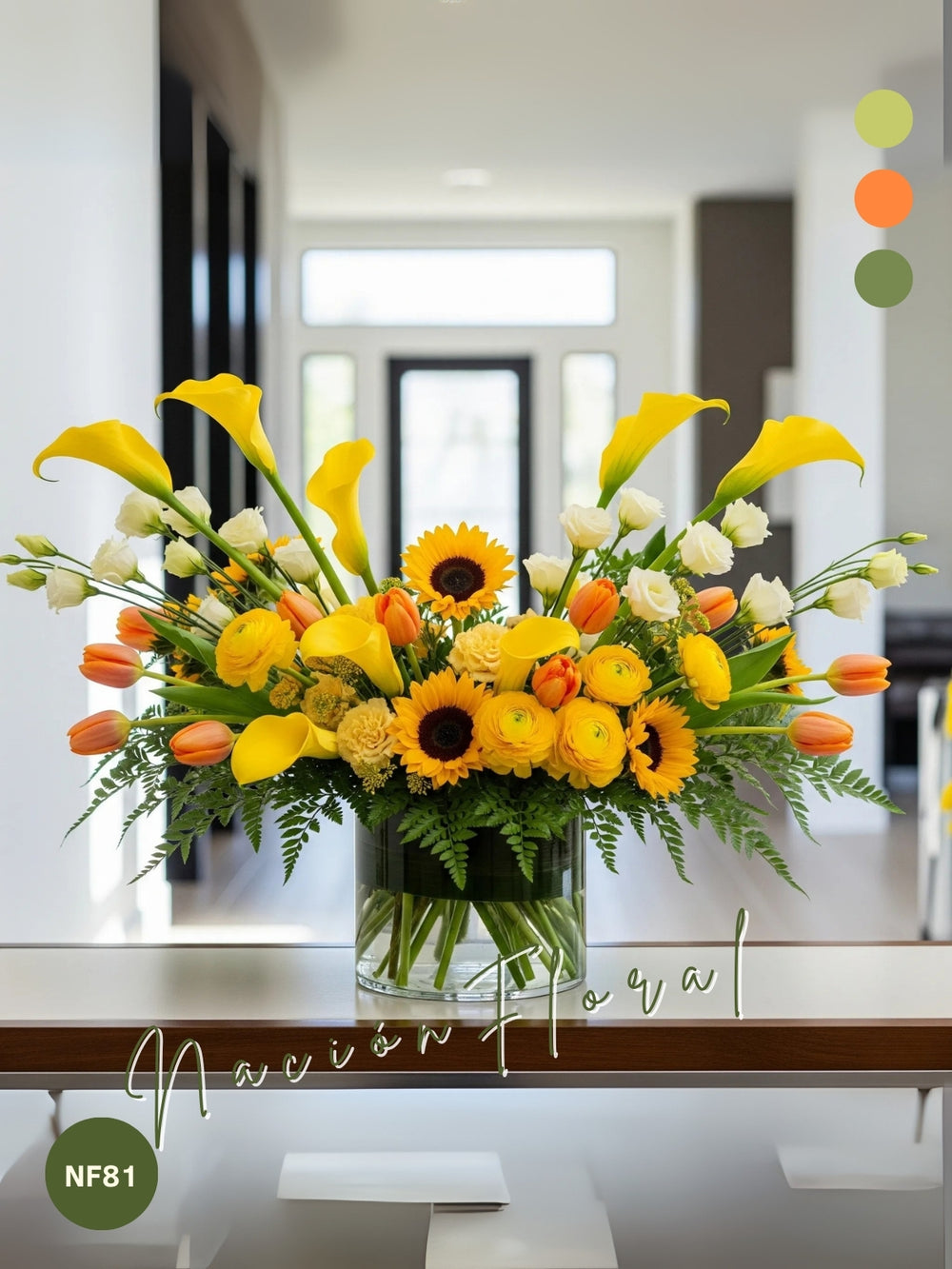 Sumérgete en una explosión de alegría y luminosidad con este vibrante arreglo floral. Diez girasoles y diez callas amarillas se combinan con diez ranunculus amarillos y diez tulipanes naranja, creando una sinfonía de tonos cálidos y vibrantes. Un ramillete de lisianthus blancos aporta un toque de frescura y equilibrio, elevando la sofisticación de la composición.