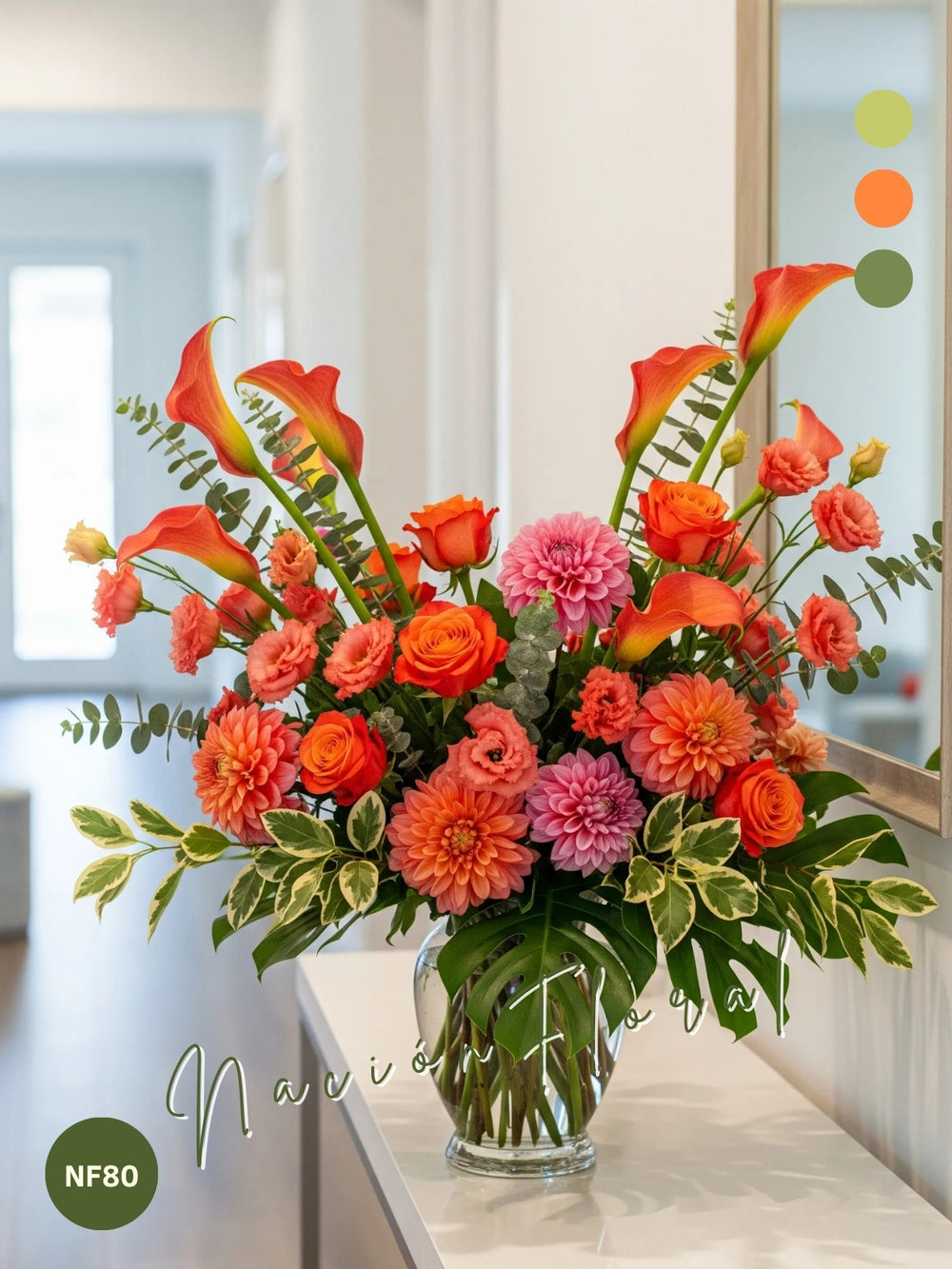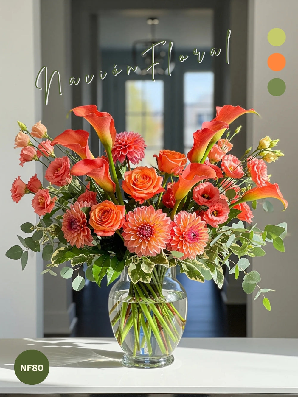 Sumérgete en la cálida luminosidad de un atardecer con este vibrante arreglo floral. Doce rosas naranja, diez callas naranja y diez dahlias rosa naranja se combinan en una sinfonía de tonos que irradian alegría y vitalidad. Un ramillete de Lisianthus rosa naranja chino añade un toque exótico y refinado, elevando la complejidad de la paleta de colores.