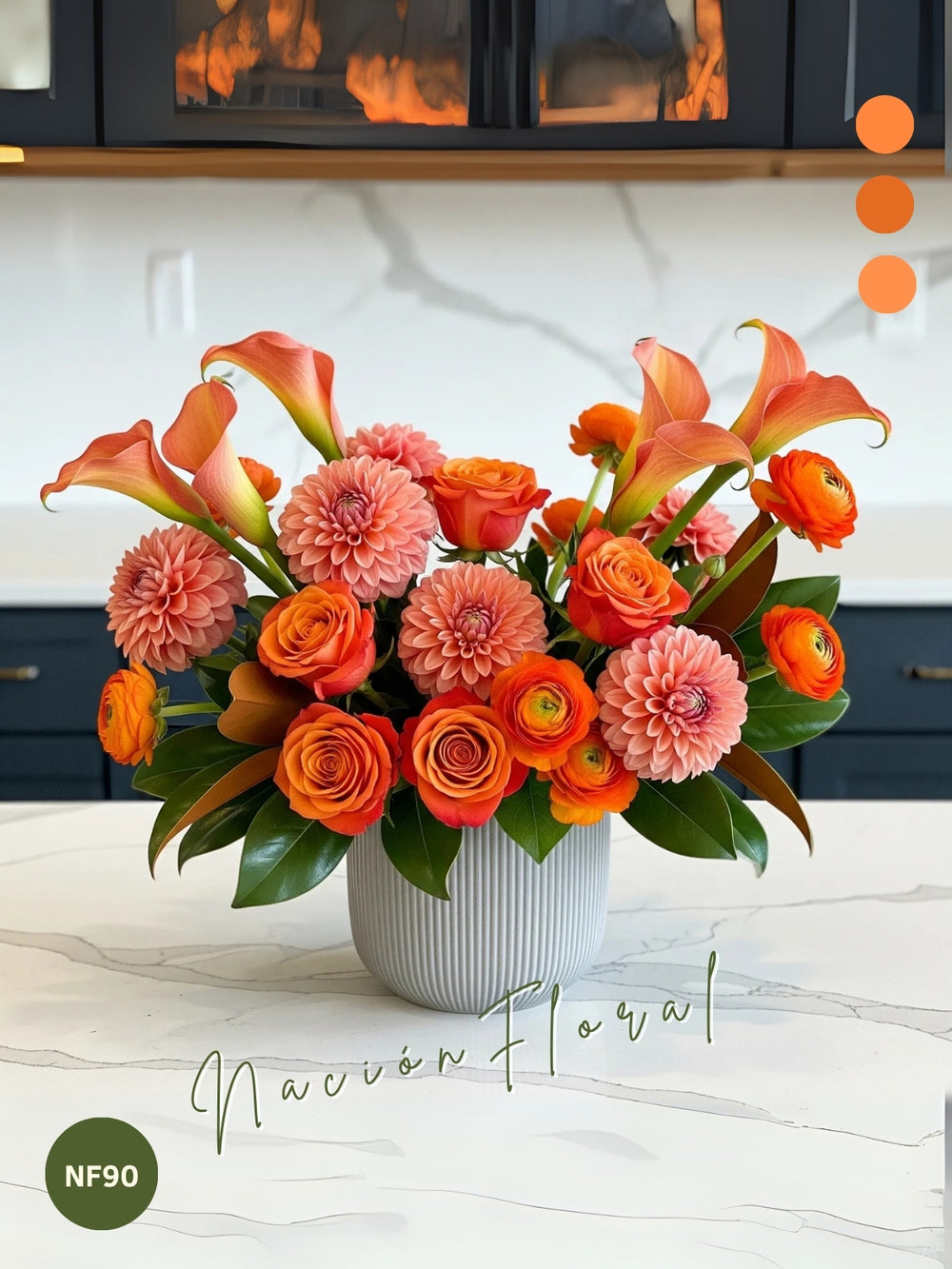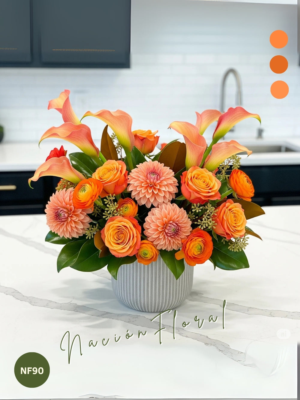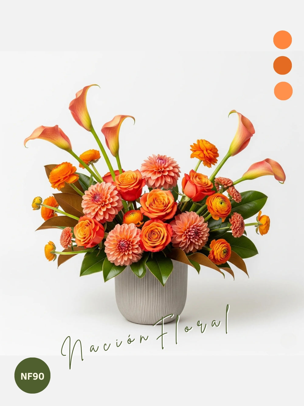 Sumérgete en la cálida luminosidad de un atardecer con este vibrante arreglo floral. Doce rosas naranja, diez callas naranja, diez dahlias rosa naranja y diez ranunculus naranja se combinan en una sinfonía de tonos que irradian alegría y vitalidad. Cada flor, con su forma y color distintivo, crea un impacto visual armonioso y cautivador que invita a la contemplación.