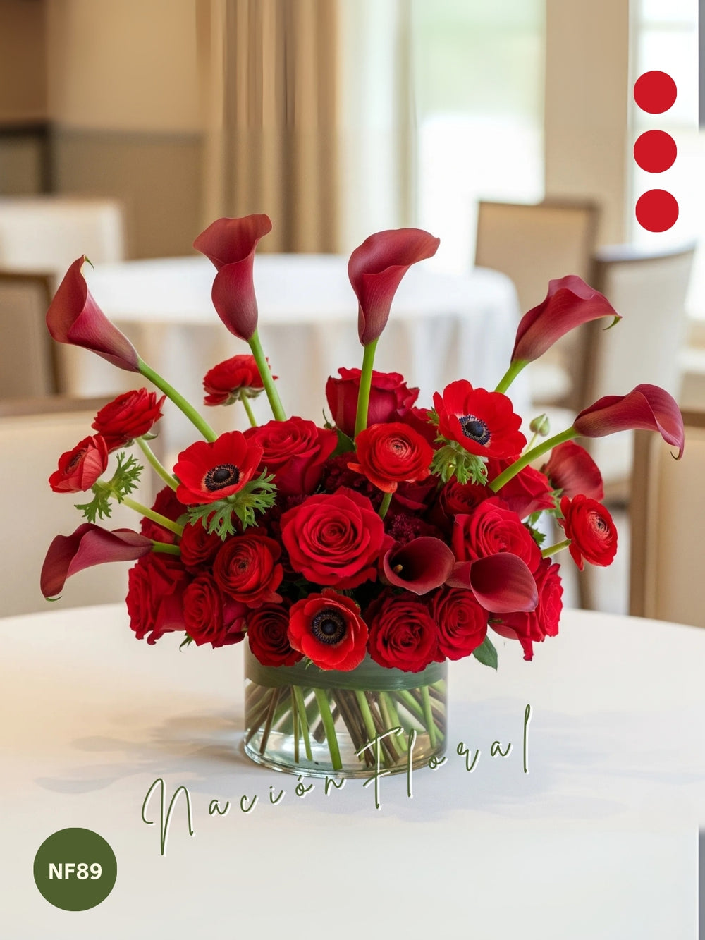 Presentado en un moderno florero de vidrio circular bajo, este diseño permite que la rica paleta de rojos sea la protagonista, irradiando calidez y energía desde cada ángulo. La forma del florero complementa la abundancia de las flores, creando un conjunto que es a la vez audaz y elegantemente contenido.