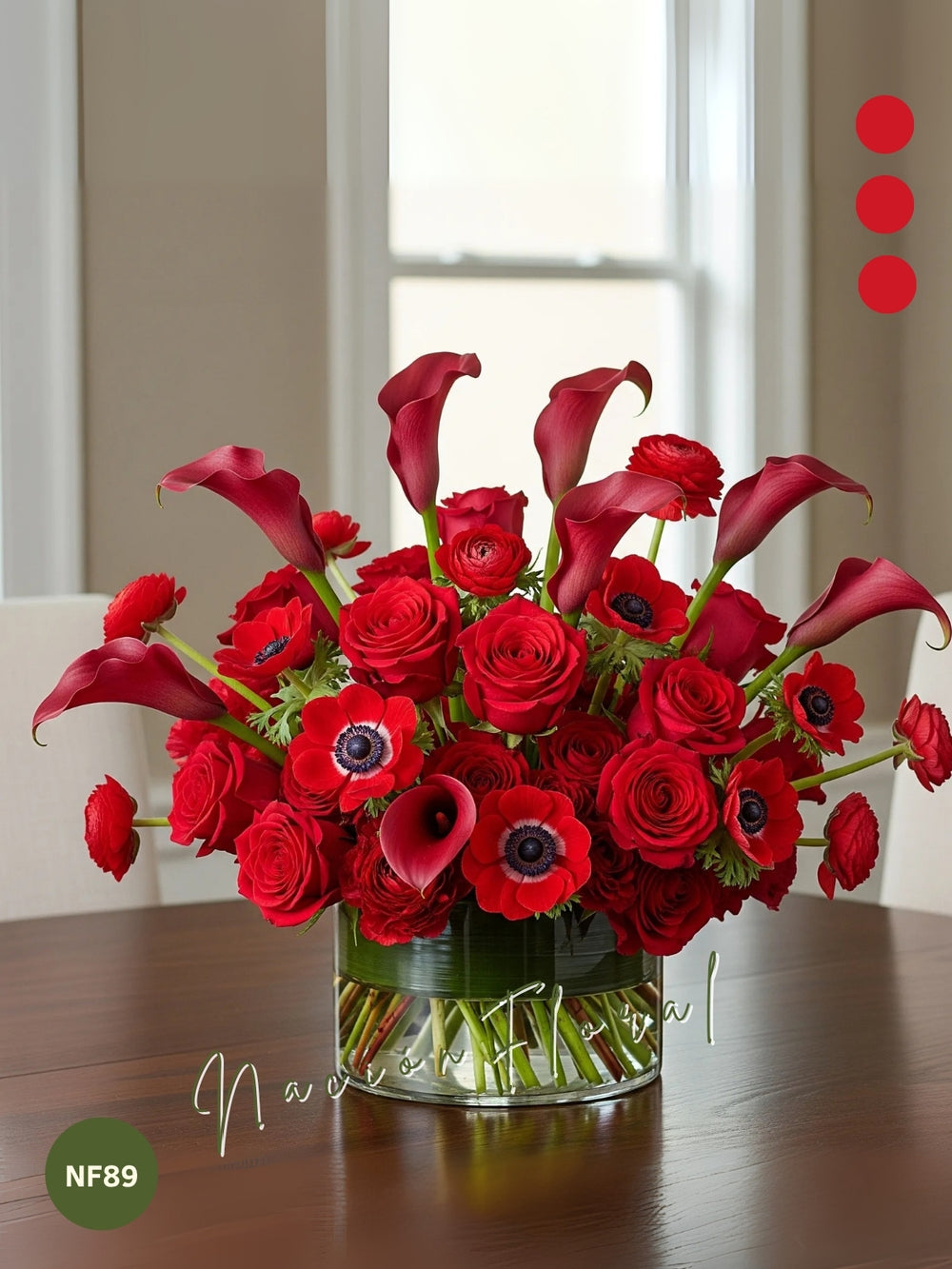 Sumérgete en la pasión y el dramatismo con este cautivador arreglo floral. Veinticuatro rosas rojas, diez anémonas rojas, diez callas rojas y diez ranunculus rojos se combinan en una sinfonía de tonos vibrantes, creando un impacto visual inigualable. La inclusión de dracenas añade un toque de verdor intenso y estructura, realzando la profundidad de la composición.