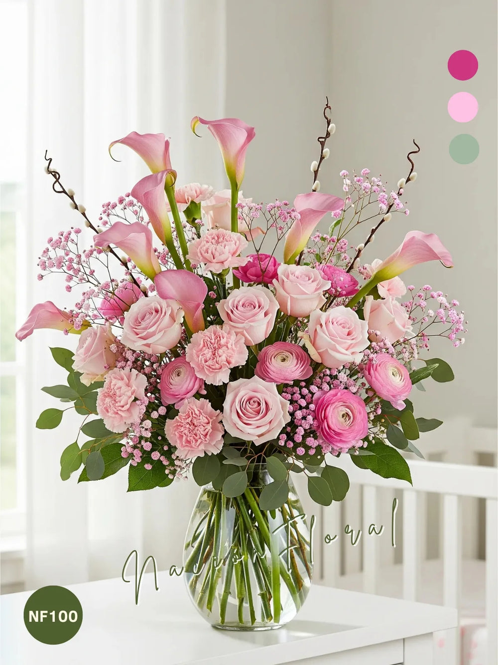 Sumérgete en un sueño romántico y delicado con este exquisito arreglo floral. Dieciocho rosas rosa, diez callas rosa, diez claveles rosa y diez ranunculus rosa se combinan en una sinfonía de tonos suaves y texturas ricas. La gipsophilia añade un toque etéreo y las varas de curly aportan un elemento de fantasía, creando una composición visualmente encantadora.