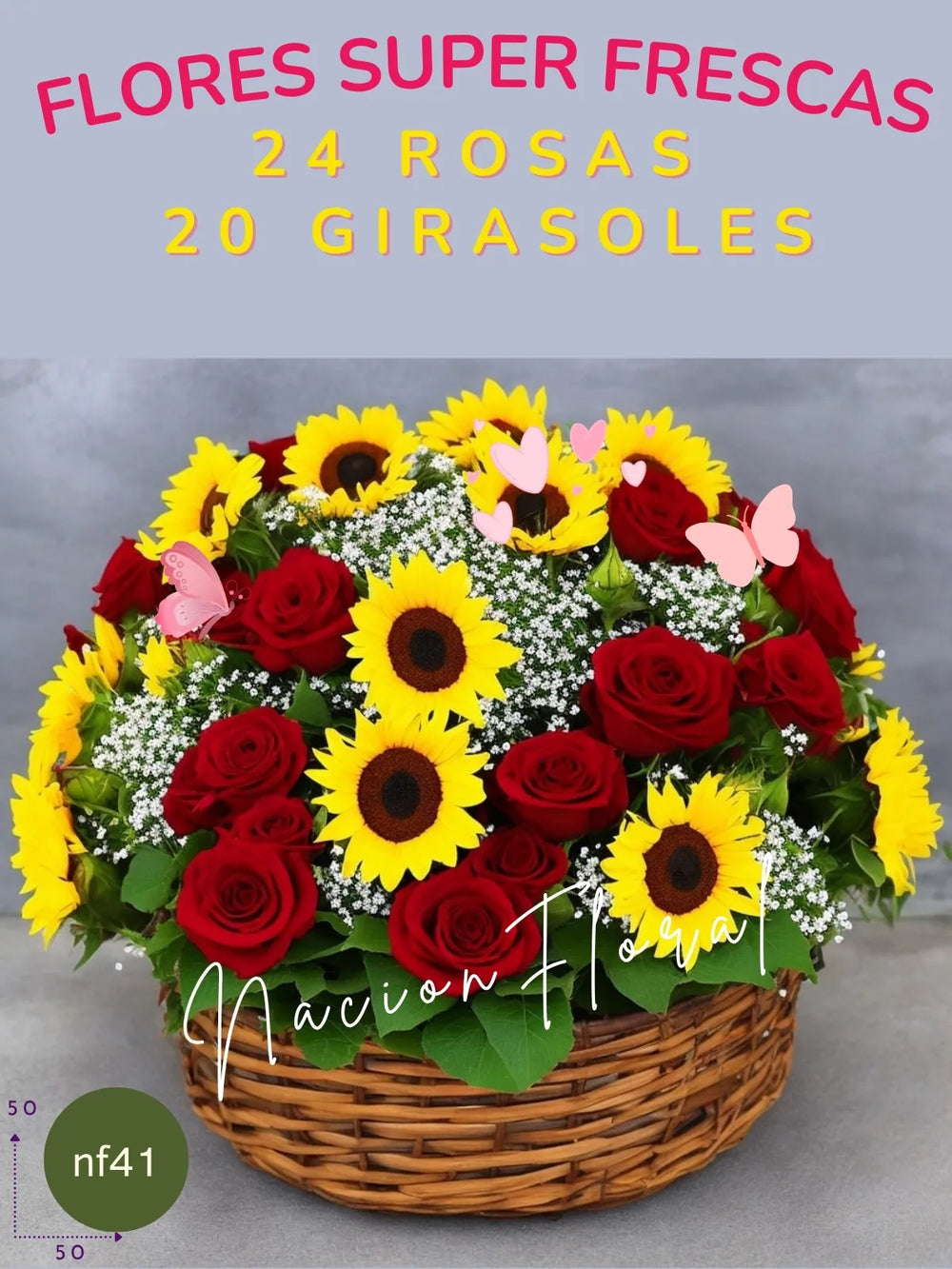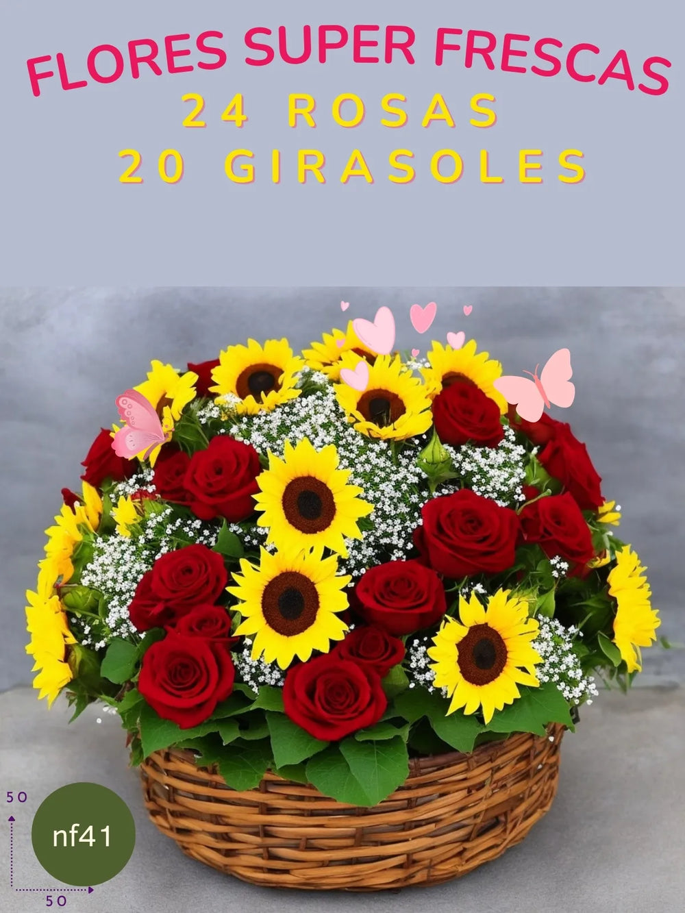 Envía un mensaje de "Te Quiero" con nuestra hermosa canasta "Caricias Florales", una explosión de pasión y alegría. Veinticuatro rosas rojas, símbolo de amor profundo, se unen a veinte girasoles medianos, que irradian vitalidad y felicidad. El baby breath añade delicadeza, y el Israeli Ruscus una base fresca, todo en una canasta reutilizable. Este arreglo es perfecto para expresar tus sentimientos más profundos de una manera única y llena de amor.