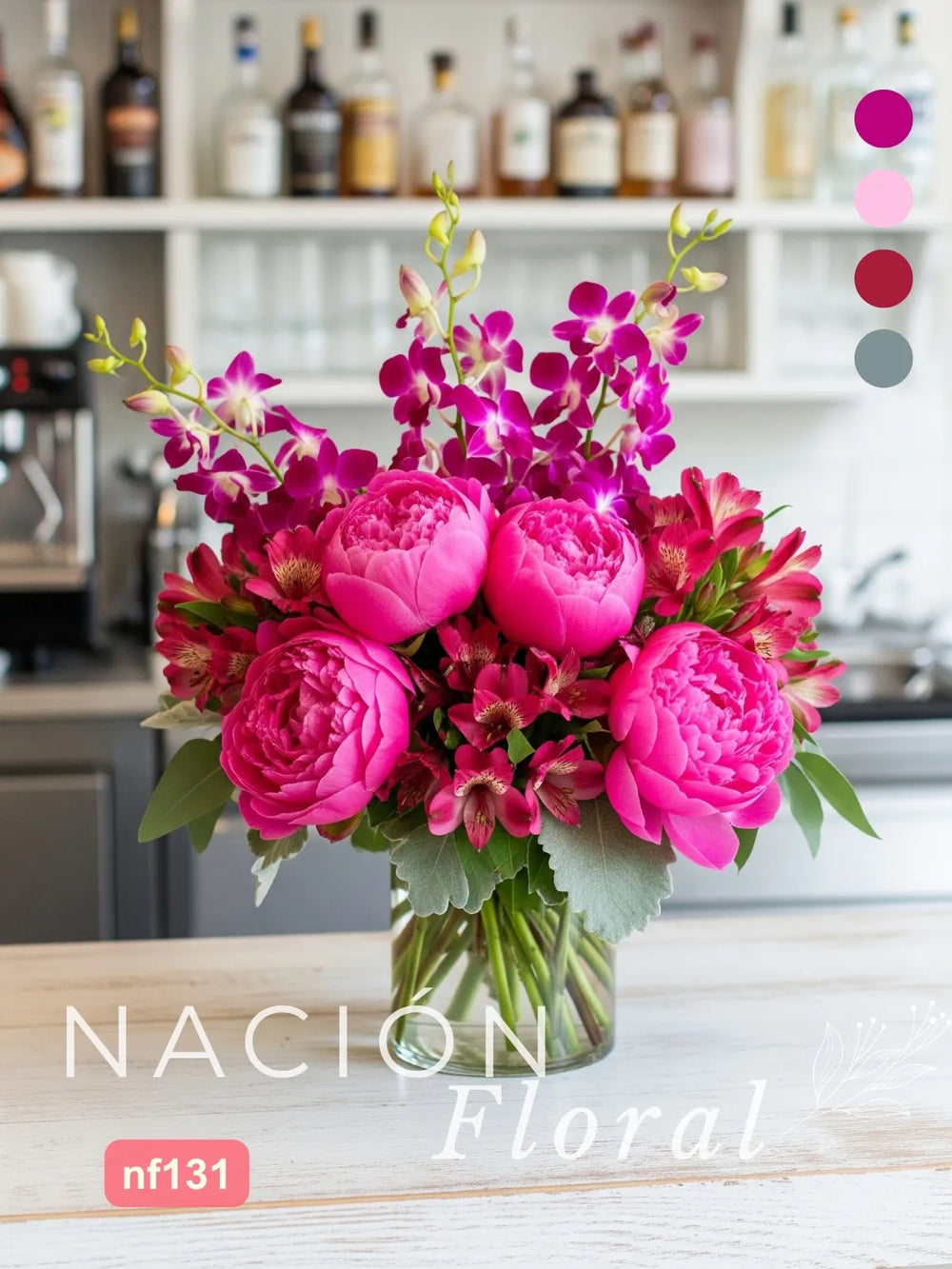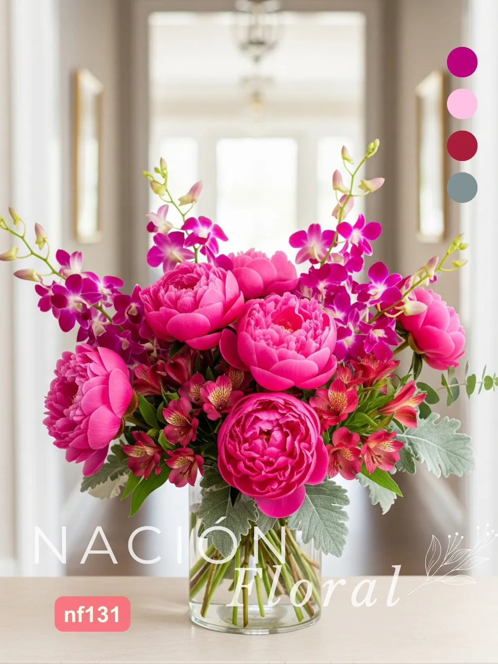 Sumérgete en un oasis de calma y elegancia con este diseño floral único. Diez Peonías rosas, símbolo de belleza y buena fortuna, se combinan a la perfección con la delicadeza de diez Orquídeas Dendrobium en tono lila. Para un toque vibrante, diez Alstroemerias fucsia añaden color y simbolizan una amistad duradera.