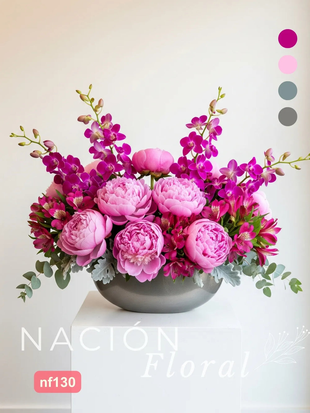 Descubre la sofisticación en su máxima expresión con nuestro exclusivo arreglo floral. Diez Peonías rosas, símbolo de romance y prosperidad, se entrelazan con la exótica elegancia de diez Orquídeas Dendrobium, creando un centro de atención inigualable. Para añadir un toque vibrante y duradero, veinte Alstroemerias fucsia aportan profundidad y un mensaje de amistad devota.