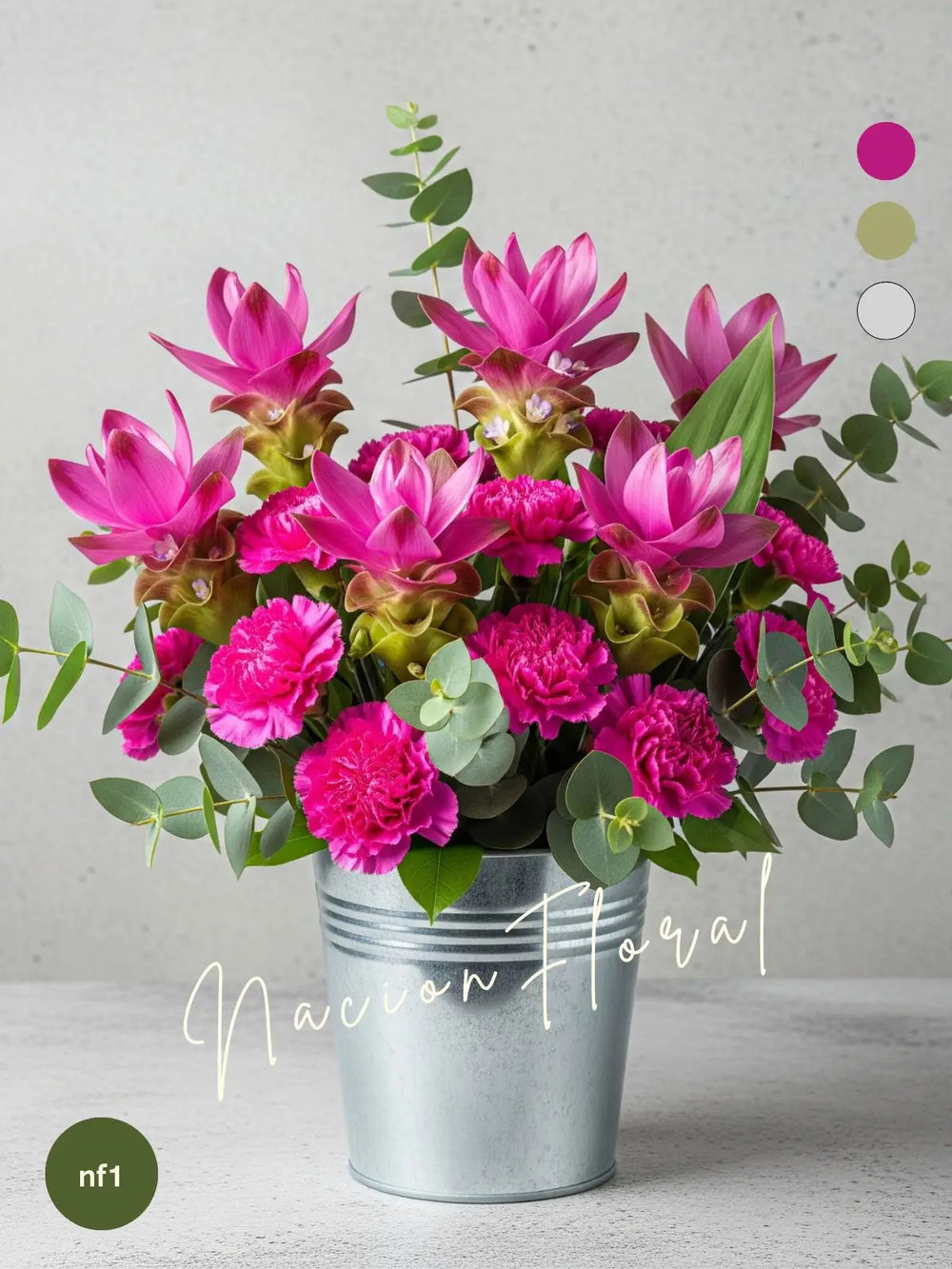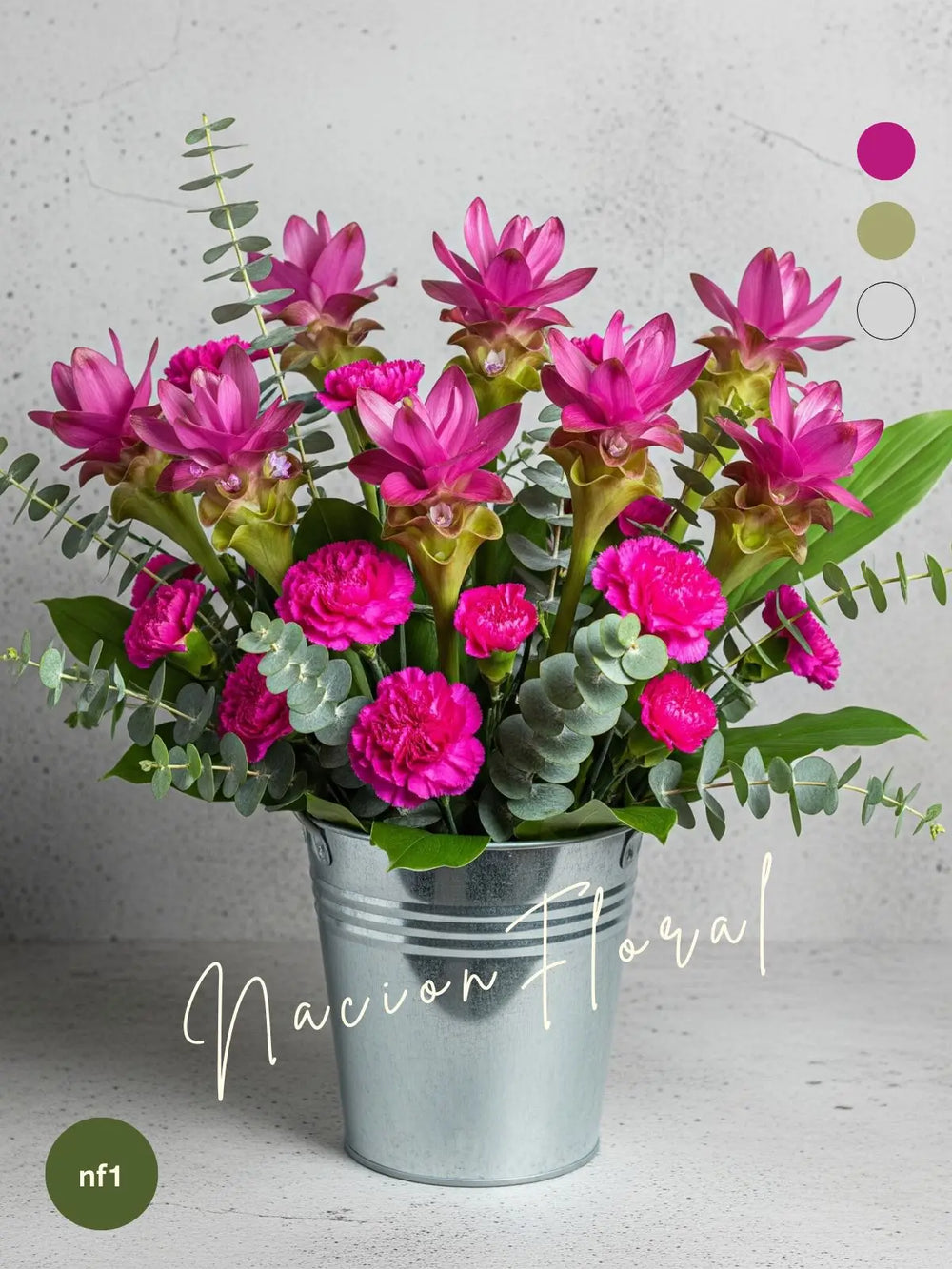 Flores: 10 tallos de cúrcuma fucsia y 20 claveles fucsia.