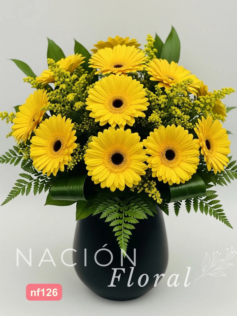 Este arreglo combina la vitalidad radiante de 10 gerberas amarillas con la ligereza aireada del solidago, creando un efecto de movimiento y frescura. El follaje leather añade un toque de textura moderna, mientras el florero de cerámica negro o gris (a elección) aporta un contraste sofisticado. Ideal para: