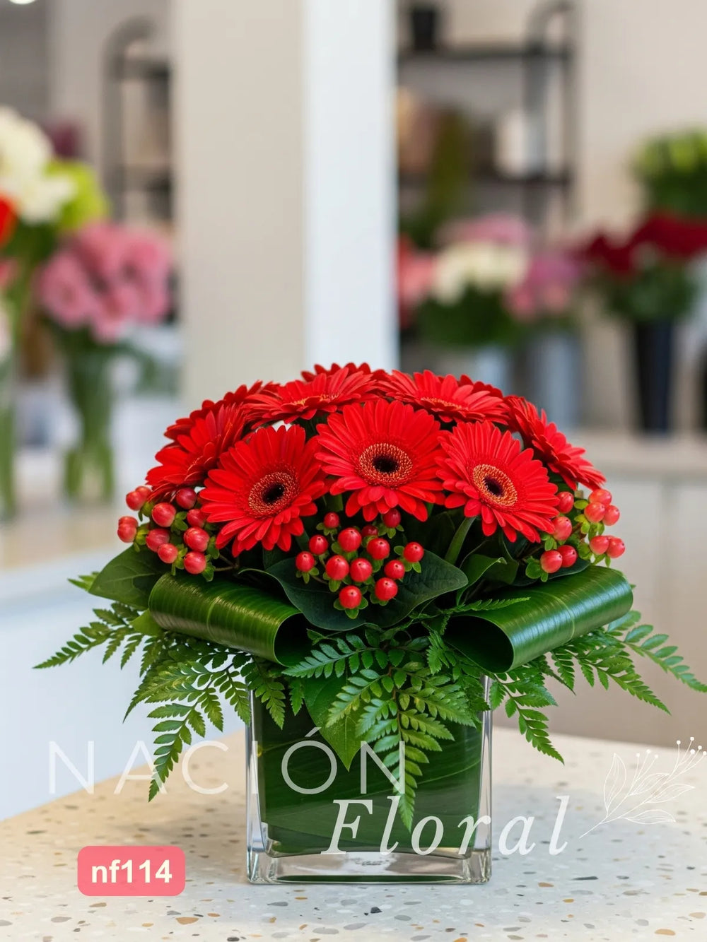 Este impactante arreglo combina la vivacidad de 10 gerberas rojas con el toque silvestre del hipericón rojo, creando un contraste entre lo clásico y lo contemporáneo. Las hojas dracenas y los tallos leather añaden profundidad y estructura, mientras el florero de vidrio tipo cubo - con su forma geométrica y transparencia - le da un aire de modernidad absoluta. Perfecto para decorar espacios minimalistas, regalar a alguien con estilo definido o como pieza central en eventos vanguardistas.