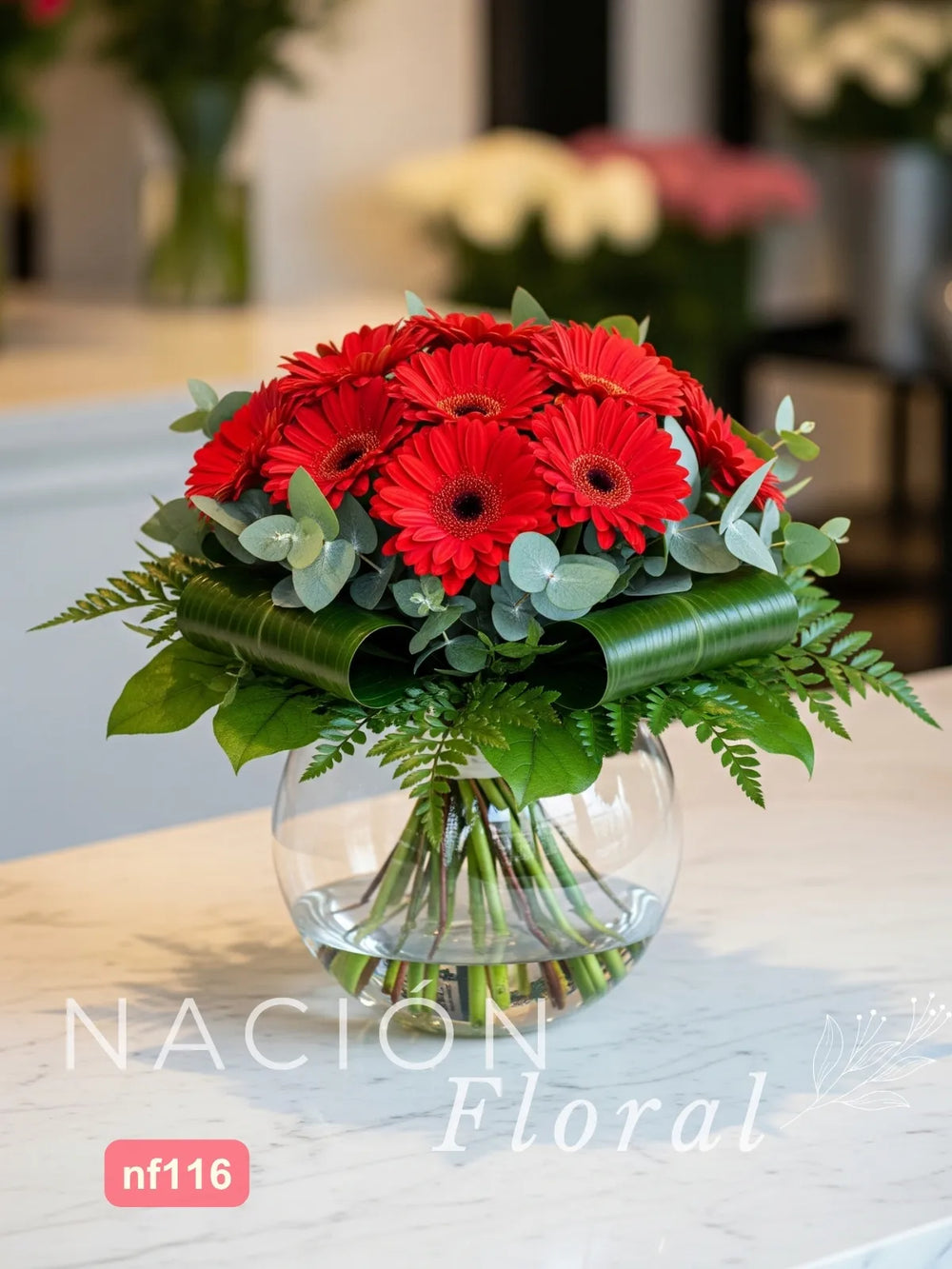Este innovador arreglo floral presenta 10 vibrantes gerberas rojas suspendidas en una esfera de vidrio transparente, creando un efecto de jardín flotante. El follaje dólar y leather añaden contrastes de textura, equilibrando la redondez perfecta de la esfera con líneas naturales. Una pieza escultórica perfecta para: