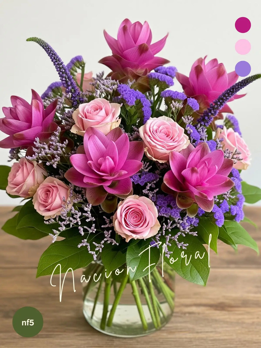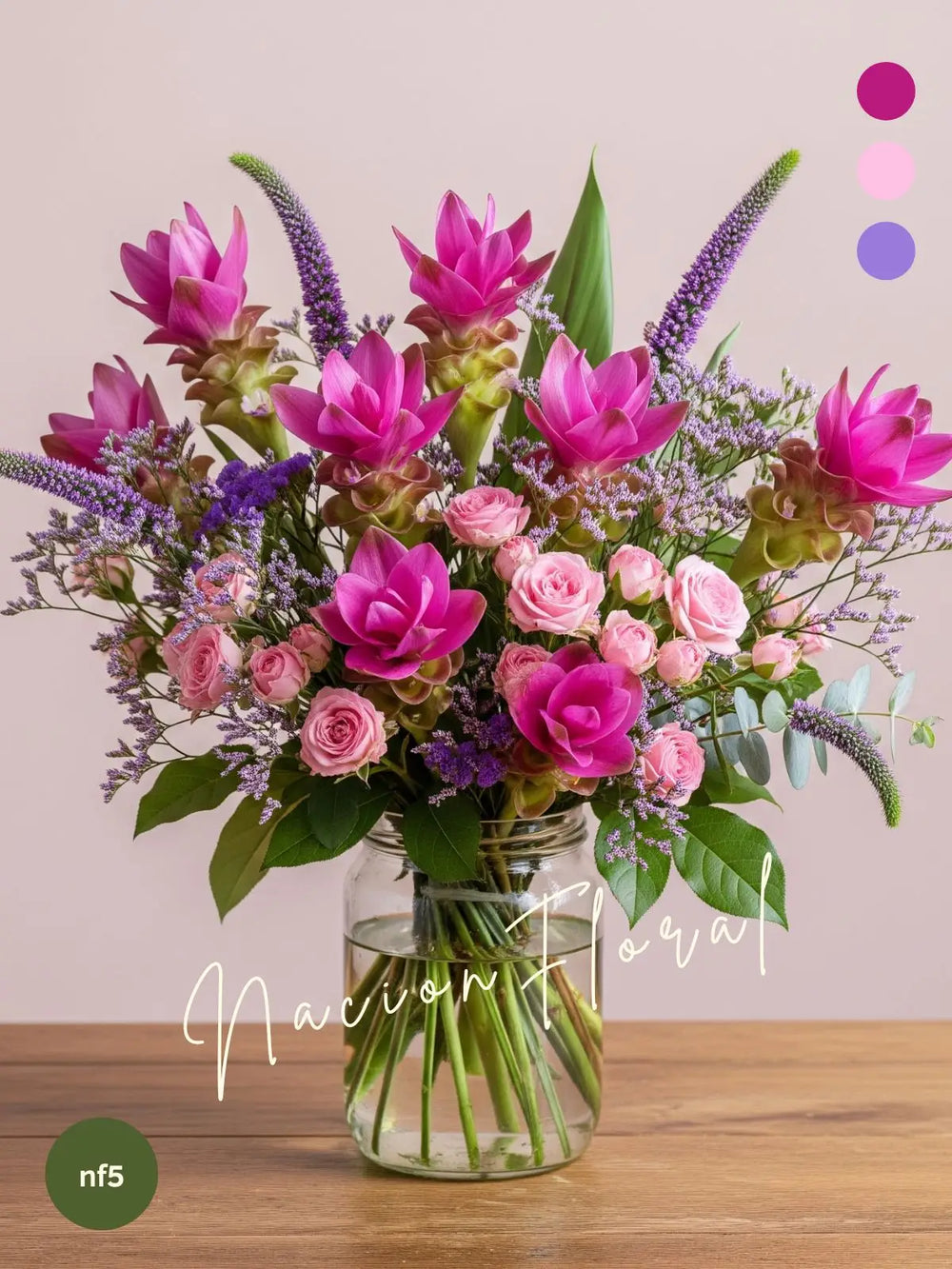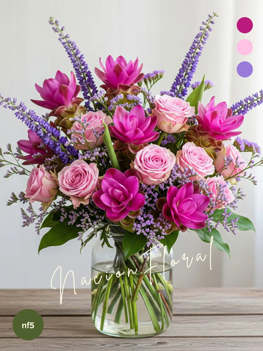 Déjate envolver por la magia de nuestro ramo "Encanto Jardín", una composición que deslumbra con la audacia de las cúrcumas fucsia, la ternura clásica de las rosas rosa, el toque etéreo del statice morado y la serena fragancia de la lavanda. Este arreglo no solo es una explosión de color y textura, sino una experiencia sensorial completa, perfecta para transformar cualquier espacio o para regalar un momento inolvidable. Es la elección ideal para quienes buscan sofisticación, frescura y un diseño que hable por sí mismo.