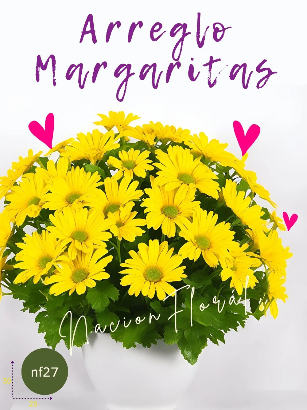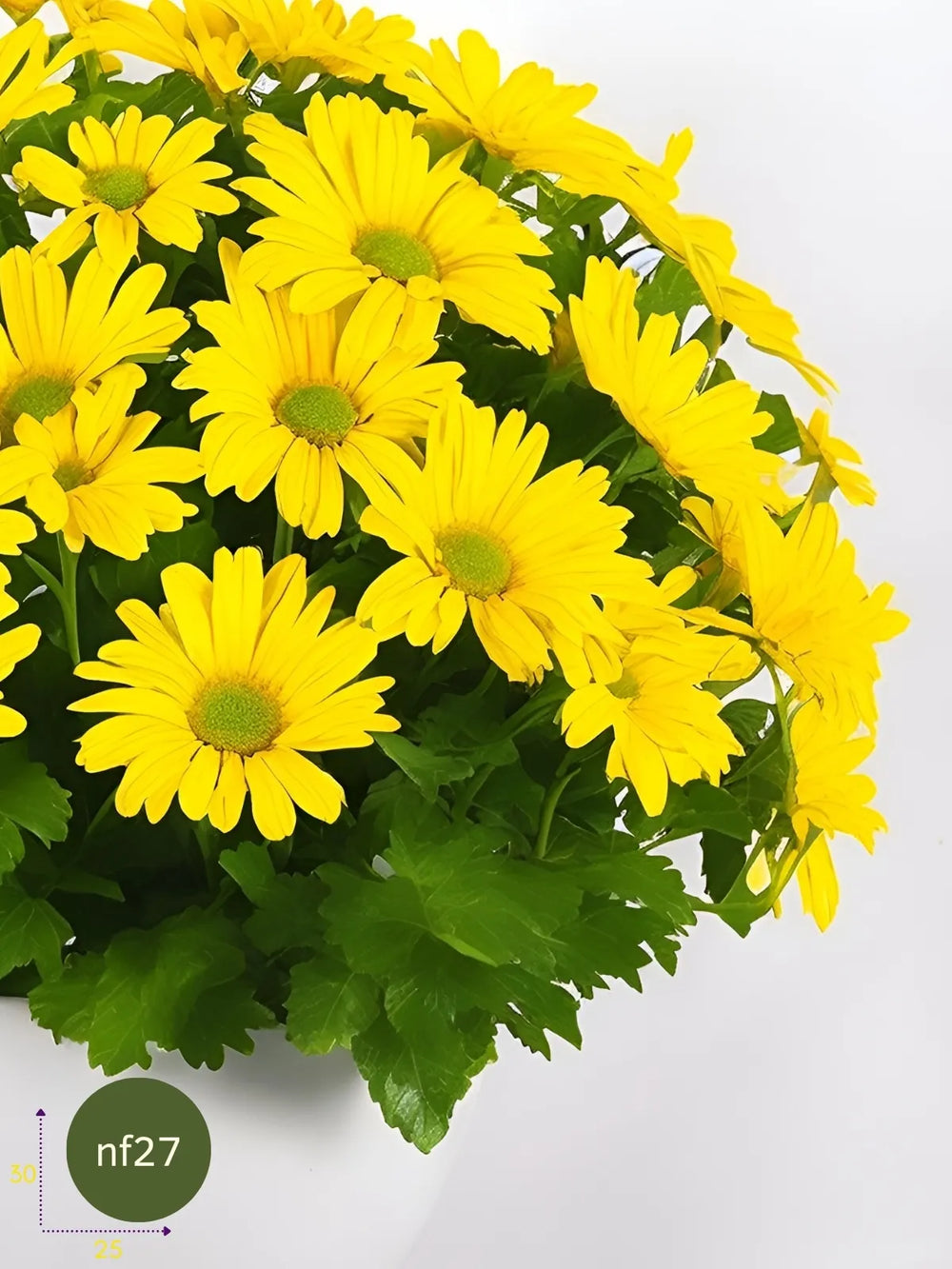 Disfruta la frescura y vitalidad de nuestro arreglo mediano con Margaritas Amarillas. Dos bounches de estas flores radiantes, con sus pétalos vibrantes y su simbolismo de alegría, se realzan con follaje Israeli Ruscus y se presentan en un florero de cerámica blanco ovalado. Este diseño no solo ilumina cualquier espacio, sino que también es un recordatorio de la felicidad que la naturaleza ofrece.