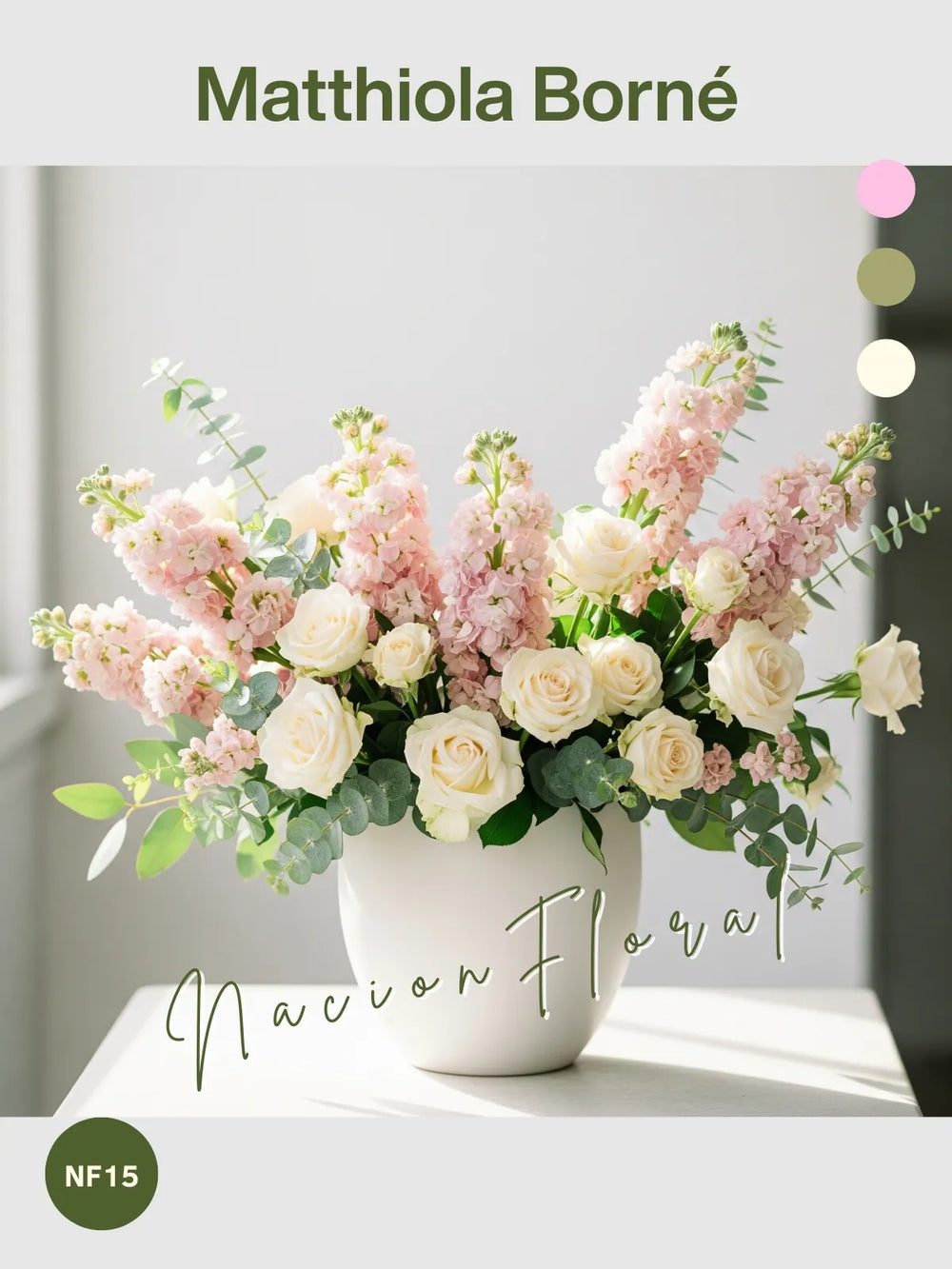 Nuestro arreglo "Matthiola Borné" redefine la sofisticación floral con su sublime armonía de tonos suaves y texturas delicadas. Diez Matthiolas rosa y veinte rosas Vendela crema, complementadas por mini rosas y el toque fresco del eucalipto Dólar, se presentan con gracia en un distintivo florero de cerámica blanca cilindro-ovalado bajo. Este diseño es ideal para regalos que transmiten distinción, transformar ambientes refinados y embellecer eventos de alto nivel con su calma y estilo contemporáneo.