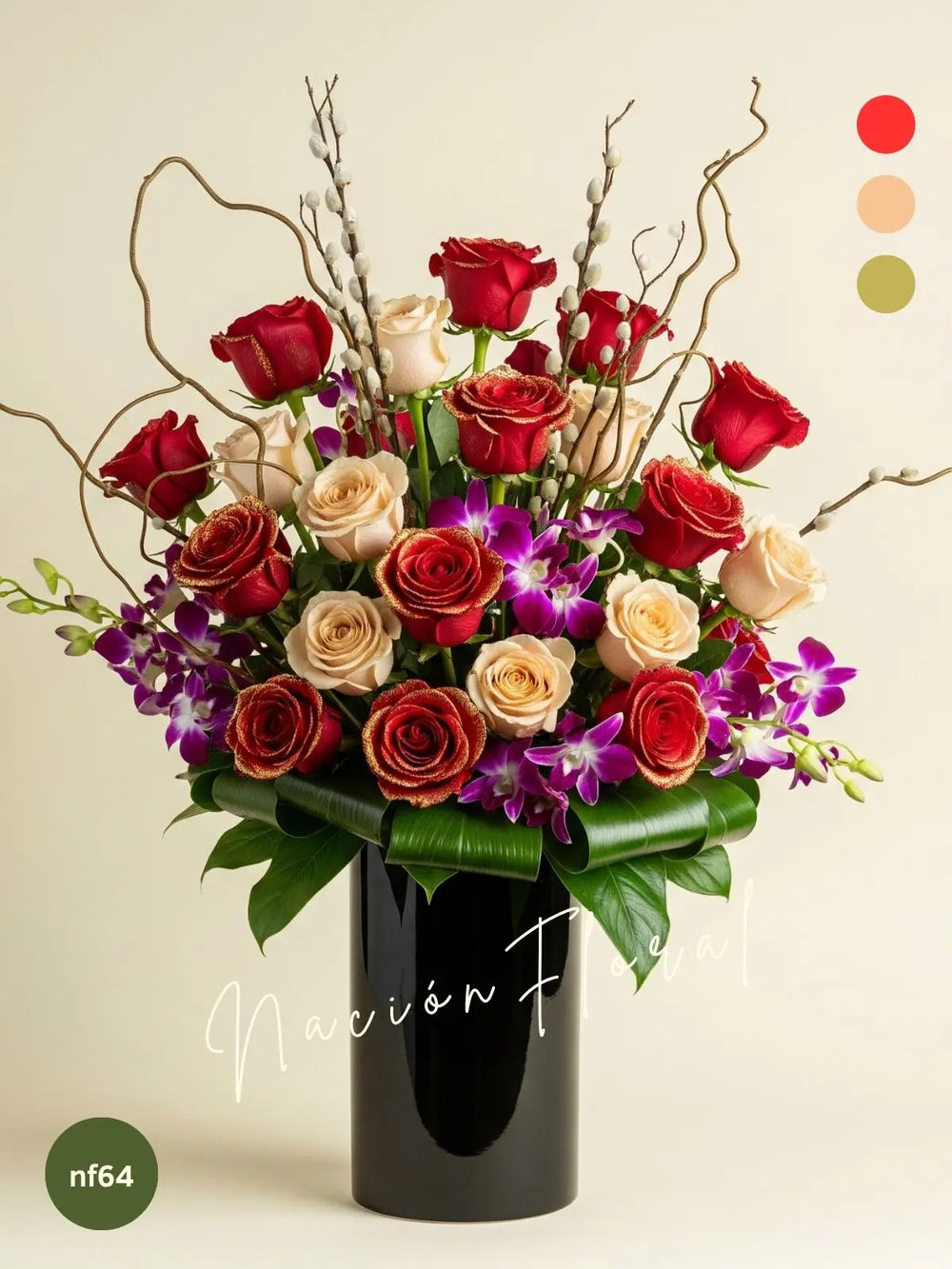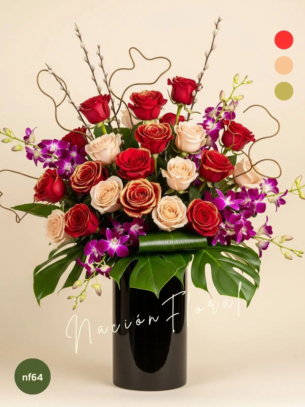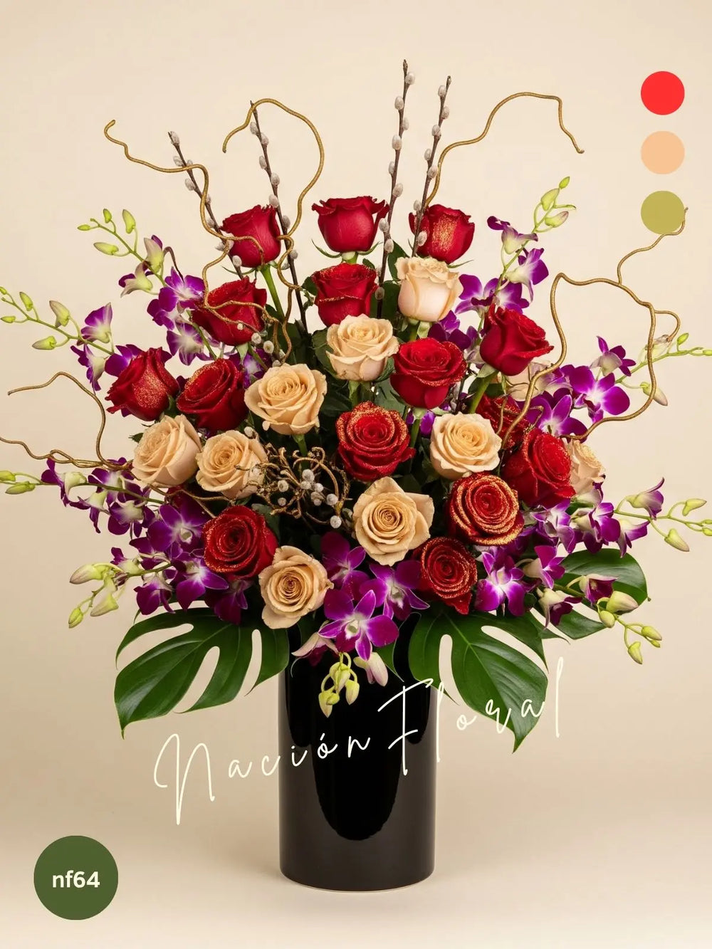 Sumérgete en la elegancia y el drama con este cautivador arreglo floral. Dieciocho rosas rojas, doce rosas Bayleys y diez majestuosas orquídeas dendrobium lila se combinan en una sinfonía de tonos.