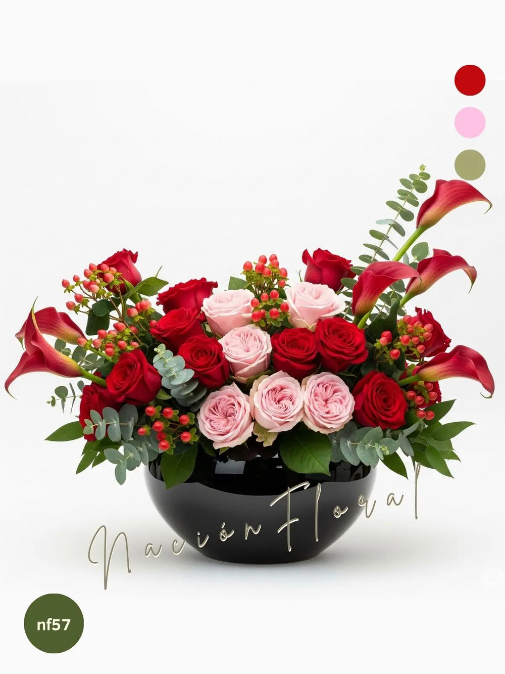 Sumérgete en la magnificencia y pasión con este impresionante arreglo. Veinticuatro rosas rojas, diez callas rojas, diez hipéricos rojos y diez exquisitas rosas inglesas David Austin o X-Pression Series se unen en una explosión de color y textura.