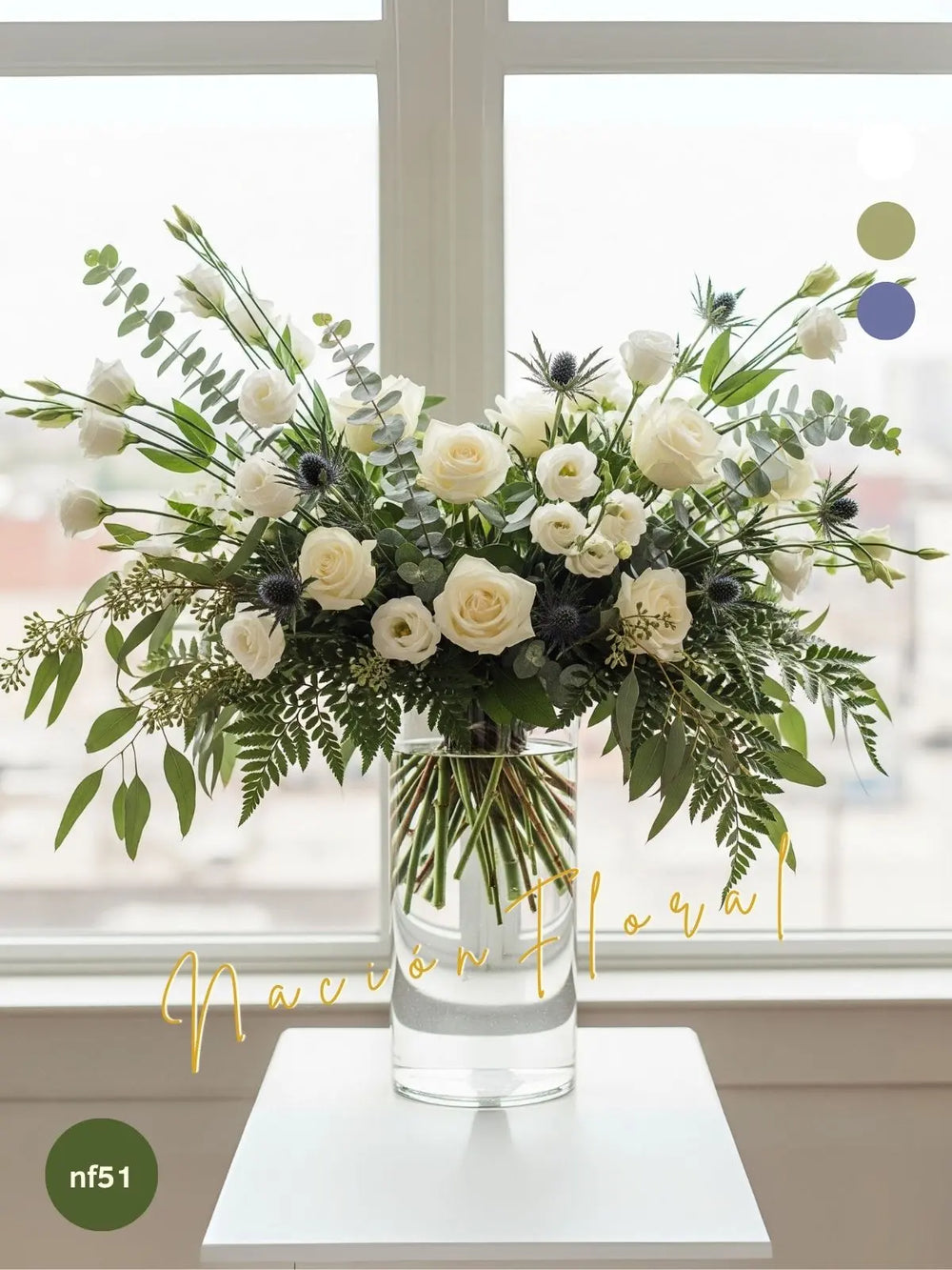 Descubre una elegancia serena y un toque de sofisticación gélida con este impresionante arreglo. Las rosas blancas y los lisianthus blancos se fusionan en un abrazo de pureza, realzado por el distintivo Eryngium azul que aporta un acento único y moderno. El follaje de eucalipto, leather y mini dólar complementa la composición con texturas variadas y un frescor natural. Presentado en un florero cilindro de vidrio alto mediano, este diseño es ideal para quienes buscan un arreglo con carácter y una belleza que irradia calma y distinción.